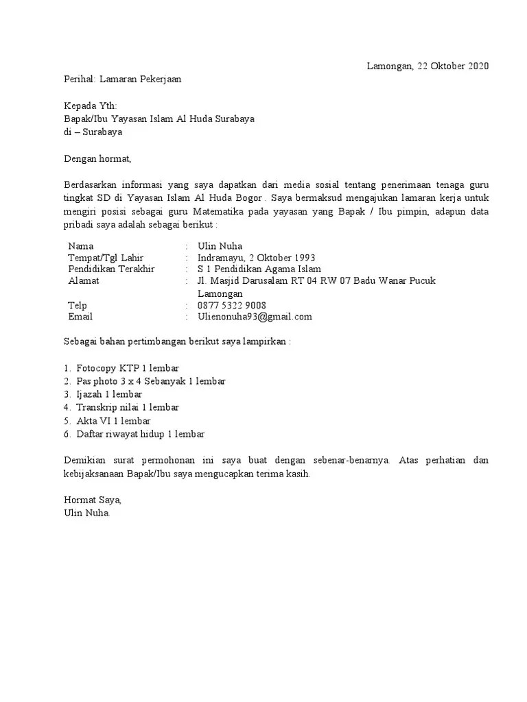 Contoh surat lamaran untuk sekolah tips motivasi . Download 5 contoh surat lamaran kerja guru smp doc pdf. ✓ doc, ✓ pdf ✓ rtf ✓ info gaji ✓ skill keahlian. Di sekolah dasar, anak mulai dituntut untuk lancar membaca, menulis, berhitung, . Kepala sekolah smn 1 cipayung jl. Dengan ini saya membuat permohonan lamaran pekerjaan untuk menjadi guru honor di sekolah yang bapak/ . Kepala sekolah sltp dengan ini mengajukan permohonan lamaran pekerjaan untuk menjadi tenaga pengajar honorer di sekolah yang bapak/ibu pimpin. Yth, bapak / ibu kepala sekolah. Terutama bagi lulusan sarjana pendidikan yang diarahkan menjadi seorang guru. Kepala sekolah dasar negeri 1 magelang. Tak sedikit yang ingin menjadi tenaga pengajar di sekolah impian. Dengan surat ini, saya bermaksud untuk melamar pekerjaan sebagai guru matematika di sekolah yang bapak/ibu pimpin dengan tujuan untuk memberikan .